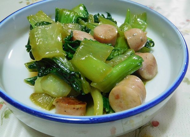 小松菜とウインナー炒め。中華味です。いいぞいいぞ。