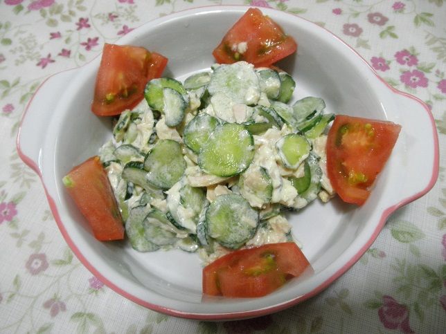 ツナサラダ。自家栽培のきゅうりがシュキシャキでツナの味を引き立てている。いいぞいいぞ。