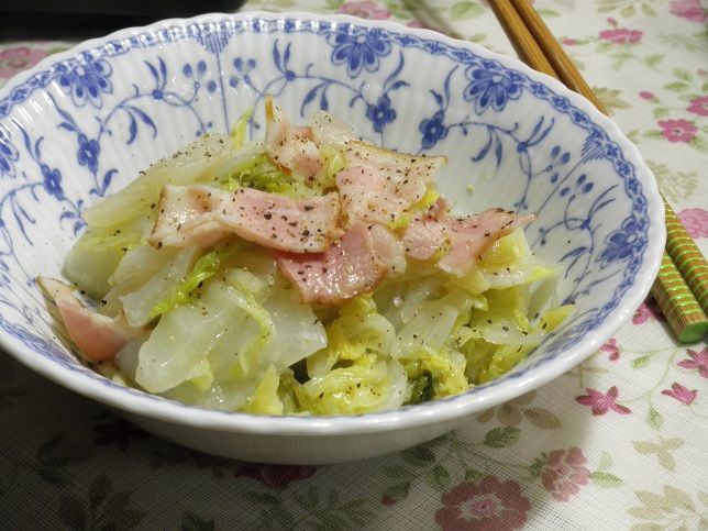 一転、洋風の煮ものは、ベーコンと白菜のスープ煮だ。コンソメ味のスープで煮込んだ白菜は、ベーコンから出た塩味もしみ込んでいい味だ。これに黒胡椒をたっぷりかけて食べると、キリっと味が引きしまって、いいぞいいぞ。