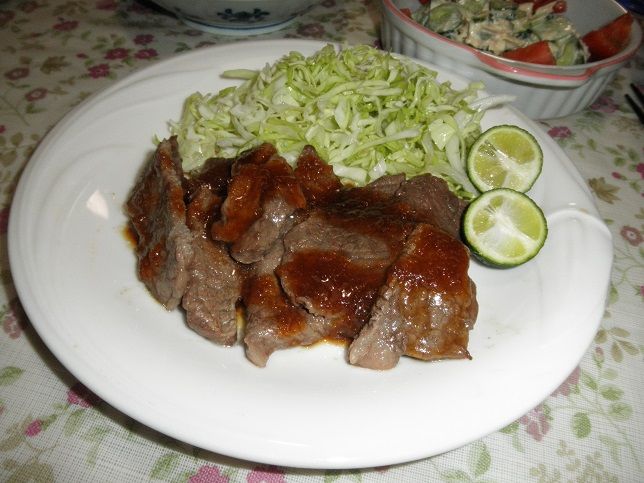 牛カルビ焼きには、おろしポン酢をかけて和風仕上げ。さわやかな酸味が、やわらかいカルビを包み込んで、いいぞいいぞ。スダチを少しかけるとまたよし。巣立ちましょうか。いいぞいいぞ。