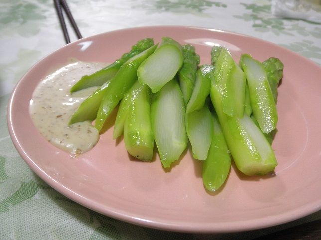 地物のグリーンアスパラをさっと湯がいて、胡麻ドレッシングでいただきます。いいぞいいぞ。