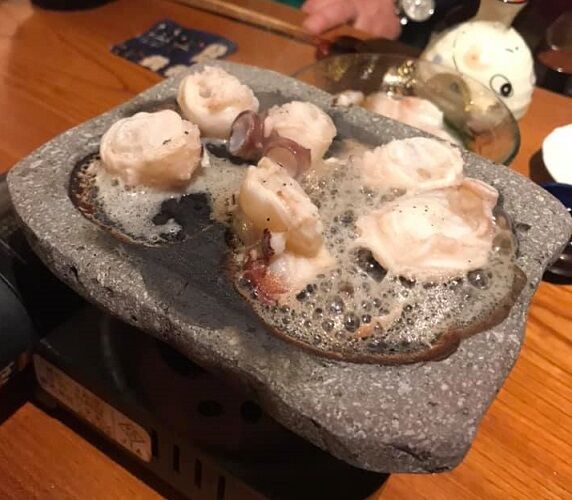 焼きタコ。新鮮なタコが石焼プレートの上で踊っていました。いいぞいいぞ。