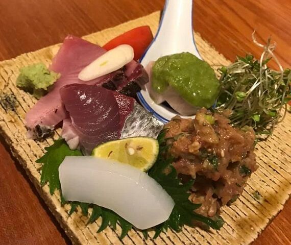 お造り。マグロのなめろうやはまちのヌタ(奥の緑のたれがかかっているもの)が絶品でした。いいぞいいぞ。