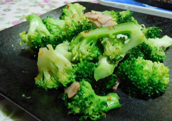 ブロッコリーのベーコン炒め。ニンニクが効いています。いいぞいいぞ。