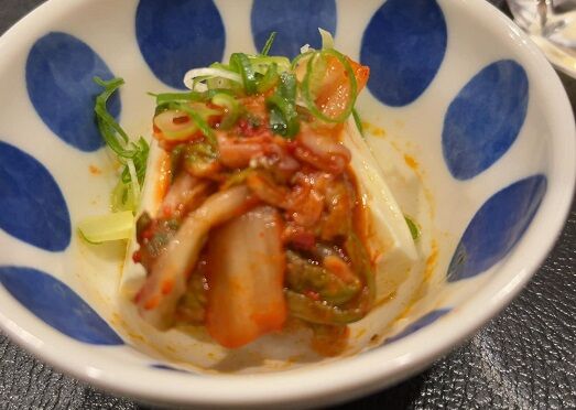 キムチ冷ややっこ。お通しです。いいぞいいぞ。