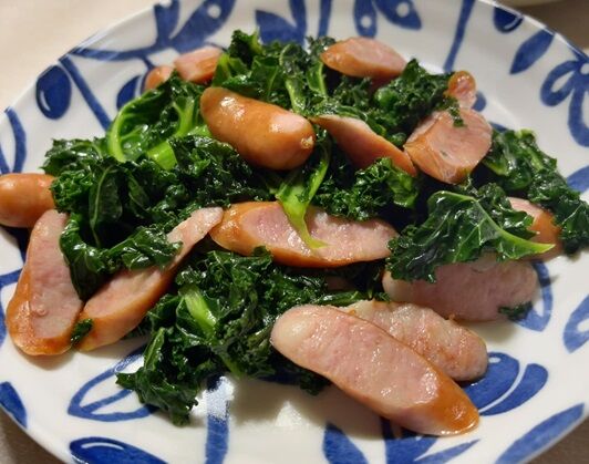 ウインナーとケールのバター炒め。青汁にも入っているケールは健康に良さそうです。いいぞいいぞ。