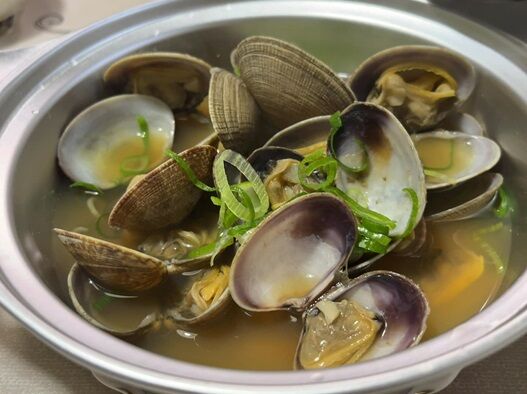 浅利の酒蒸し。スープに貝の出汁がしみでています。いいぞいいぞ。