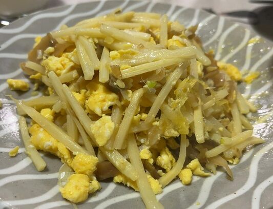 筍と搾菜の卵炒り。搾菜が味の決め手です。いいぞいいぞ。