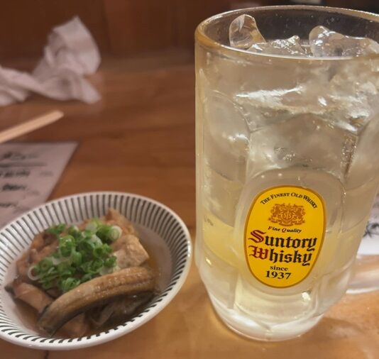 ハイボール&お通し。始まりはこれです。お通しは鮭の南蛮漬けでした。いいぞいいぞ。
