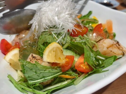 海鮮サラダ。炙り帆立が入った豪華なサラダです。いいぞいいぞ。