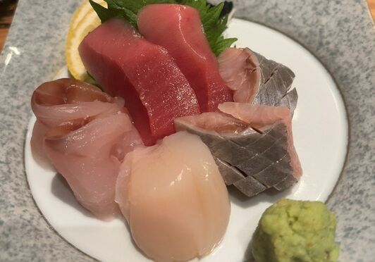 刺身盛り合わせ。帆立・かんぱち・鮪中トロ・鰊です。いいぞいいぞ。