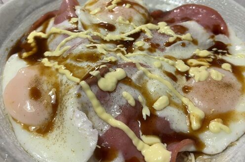 ハムエッグ。キャベツを敷いてお好み焼き風です。いいぞいいぞ。
